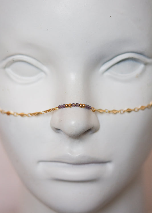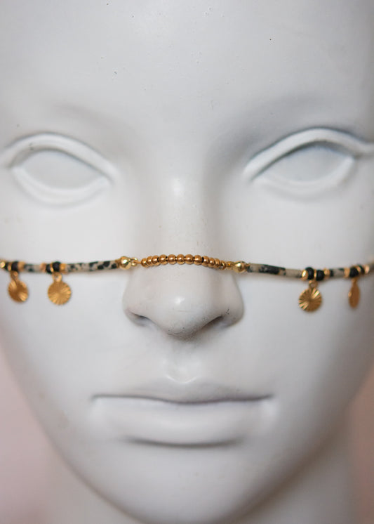 Ornements métalliques qui encadrent et décorent le visage, la création signature de...