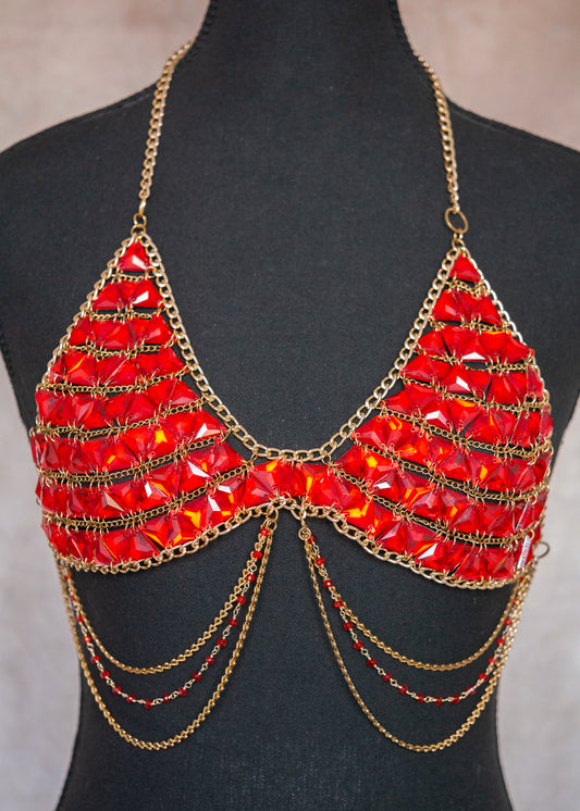 Parures d'épaules, brassières travaillées en chaînes, cristaux et/ou perles, top originaux et autres ornements pour le buste : toutes les créations destinées au haut du corps.